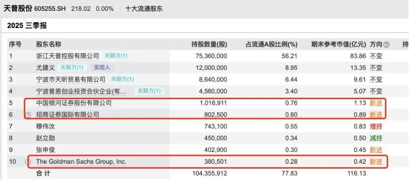 截至2025年三季度末,新晋前十大流通股的机构投资者分别是中国银河(持股占比0.76%)、招商证券国际(持股占比0.6%)以及高盛集团(持股占比0.28%)。