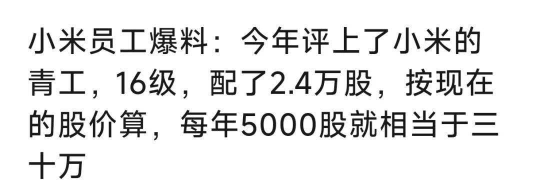 前两天刚转发了电子科大多名毕业生被评为小米青年工程师的消息,今天就看到了一位小米员工的爆料:“今年评上小米青工,16级直接配2.4万股,按当前股价算配资门户首页,每年归属5000股就相当于三十万!”